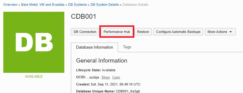 - Basic Management: includes 14 basic monitoring metrics such as CpuUtilization and StorageAllocated. It also includes ASH Analytics and SQL Monitoring features in Performance Hub for CDBs, but not for PDBs. I selected Basic Management as it is FREE Option