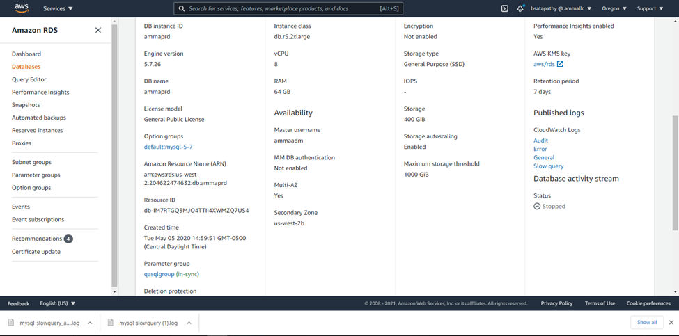 You will see the slow query log on AWS console -> RDS – > AMMAPRD -> Logs and events